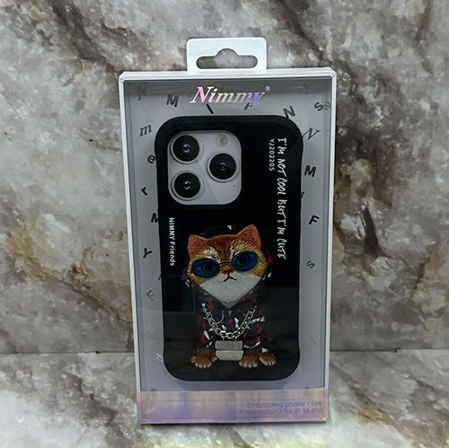 Задняя крышка Nimmy Iphone 14 Pro матовая, с вышивкой, кот с цепочкой, черная
