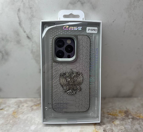 Задняя крышка Iphone 15 Russia под кожу рептилии с Гербом РФ, серая