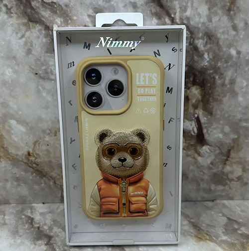 Задняя крышка Nimmy Iphone 15 Pro матовая, с вышивкой, мишка в куртке с замочком, бежевая