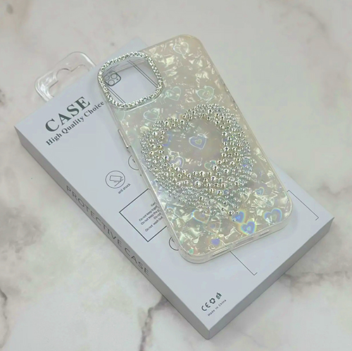 Задняя крышка Iphone 15 Pro Fashion Case перламутровая, сердце из страз и окантовка камеры, белая