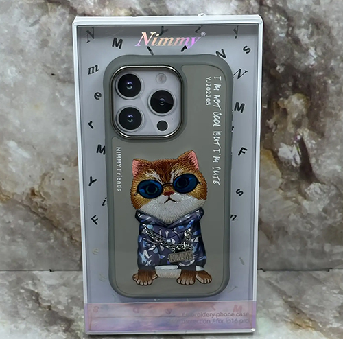Задняя крышка Nimmy Iphone 16 Pro матовая, с вышивкой, кот с цепочкой, серая