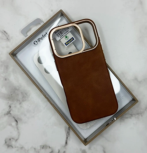 Задняя крышка iPefet Iphone 16 Pro под кожу с Magsafe, камера подставка, бархат внутри, металл. кнопки, коричневая