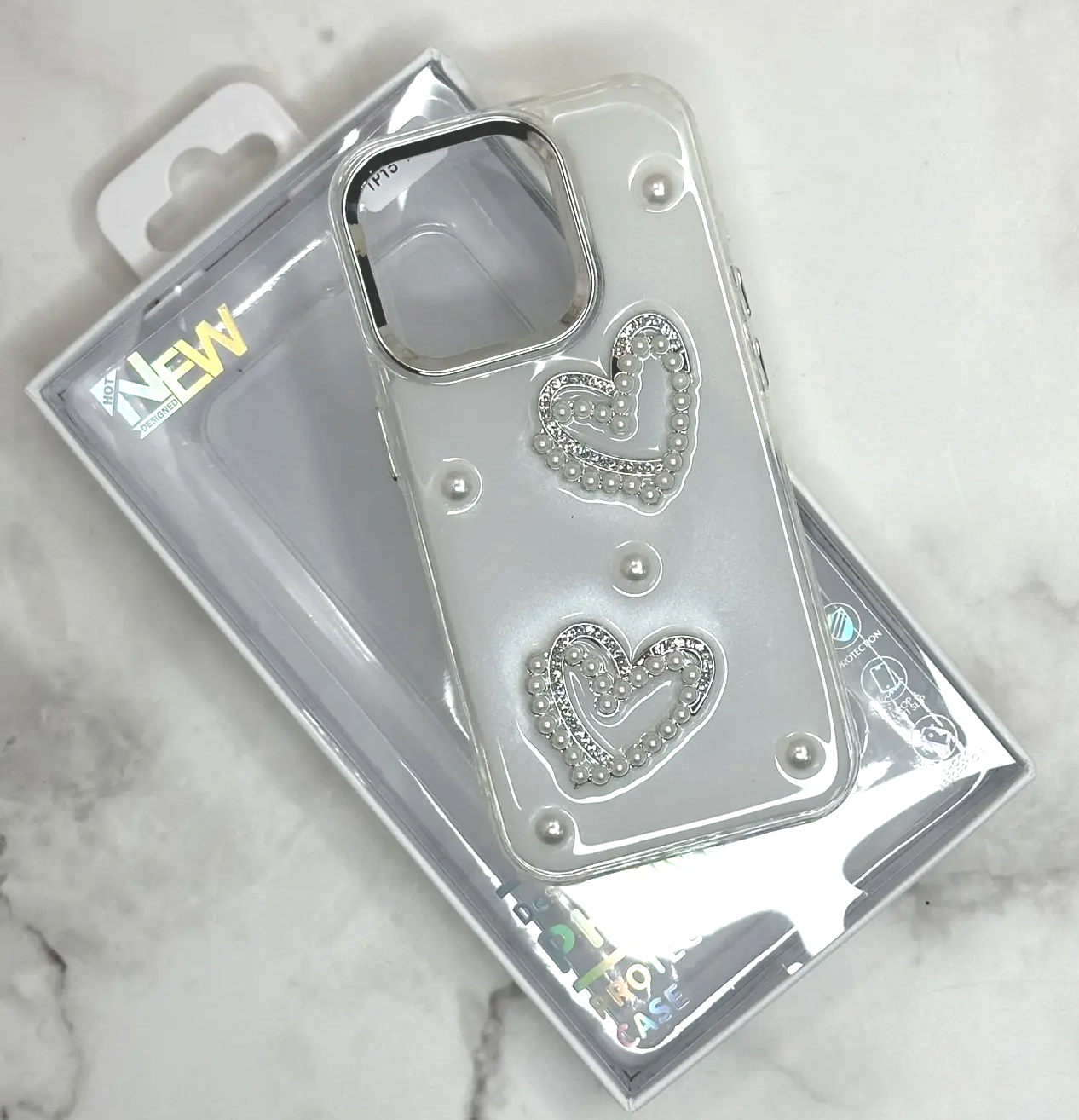 Задняя крышка Iphone 16 Pro глянцевая блестящая, с накладными фигурками, серебристые сердца