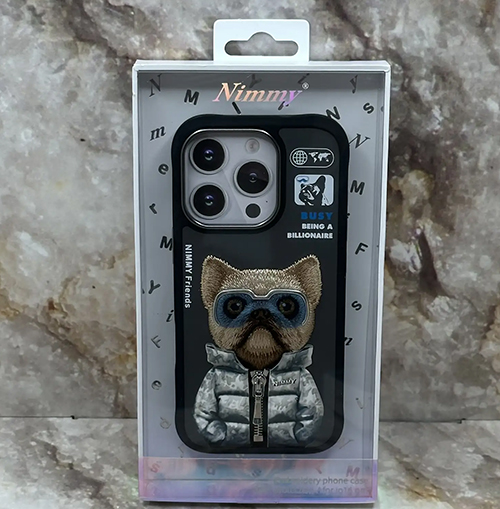 Задняя крышка Nimmy Iphone 16 Pro Max матовая, с вышивкой, бульдог в куртке с замочком, черная