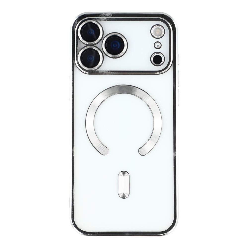 Силиконовый чехол Iphone 17 Pro Max прозрачный в сеточку, с защитой камеры, magsafe, глянцевый борт, в блистере, серебро