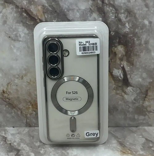 Силиконовый чехол Samsung Galaxy S26 Ultra прозрачный в сеточку, с защитой камеры, magsafe, глянцевый борт, в блистере, серебряный 8290024602