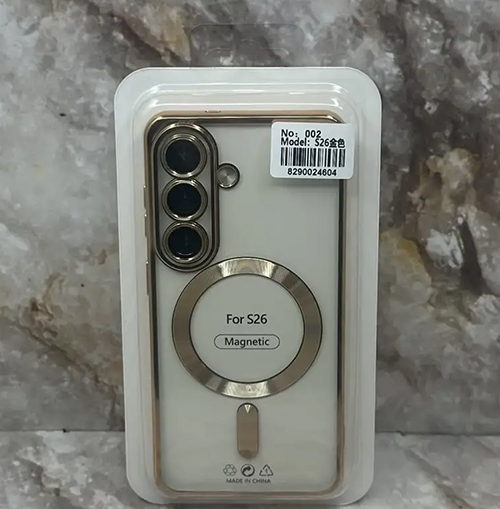 Силиконовый чехол Samsung Galaxy S26 Ultra прозрачный в сеточку, с защитой камеры, magsafe, глянцевый борт, в блистере, золотой 8290024604