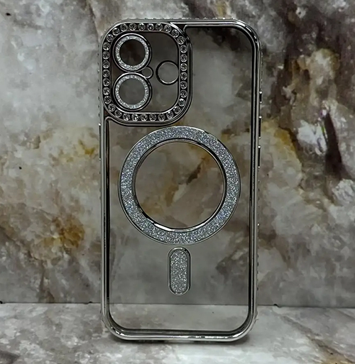 Силиконовый чехол Iphone 17 Pro прозрачный, цветной борт со стразами, MagSafe из блесток, серебристый