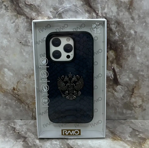 Задняя крышка Iphone 15 RMO под кожу рептилии с Гербом РФ, в коробке, черная