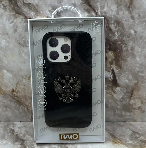 Задняя крышка Iphone 15 Pro RMO под кожу рептилии с Гербом РФ, в коробке, черная