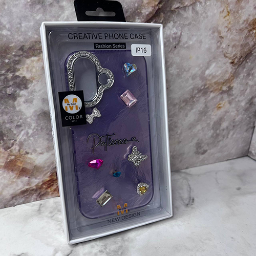 Задняя крышка MY COLOR Iphone 15 Pro переливающиеся Patience, стразы вокруг камеры, сиреневая