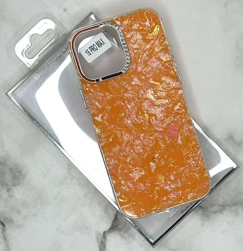 Задняя крышка Iphone 15 Pro Max iNKANUO CASE перламутровая, стразы вокруг камеры, прозрач. силиконовый борт, оранжевая