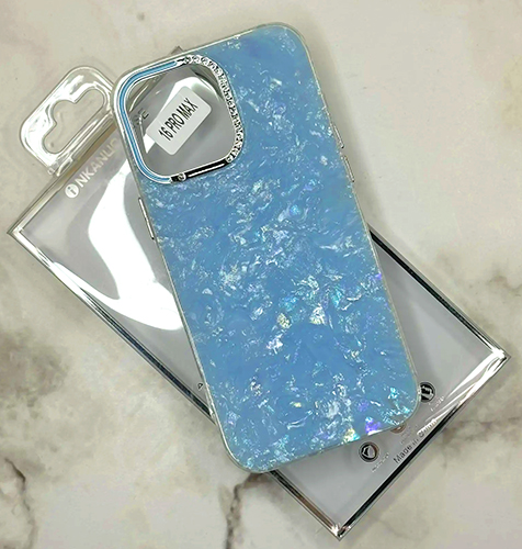 Задняя крышка Iphone 15 Pro Max iNKANUO CASE перламутровая, стразы вокруг камеры, прозрач. силиконовый борт, голубая