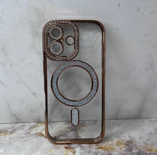 Силиконовый чехол Iphone 16 Pro прозрачный, цветной борт со стразами, MagSafe из блесток, золотой
