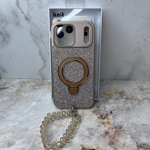 Задняя крышка KNIT Iphone 16 Pro Max со стразами, MagSafe-подставка + бусы на руку, золотая