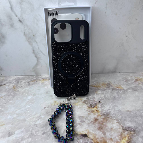 Задняя крышка KNIT Iphone 16 Pro Max со стразами, MagSafe-подставка + бусы на руку, черная