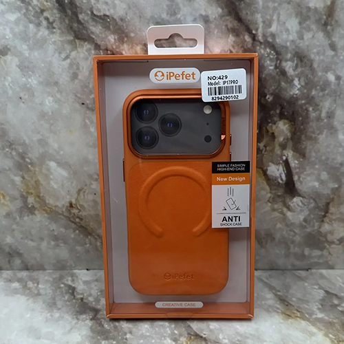 Задняя крышка iPefet Iphone 17 Pro под кожу с MagSafe, силиконовый борт, металлическая оконтовка камеры, оранжевая