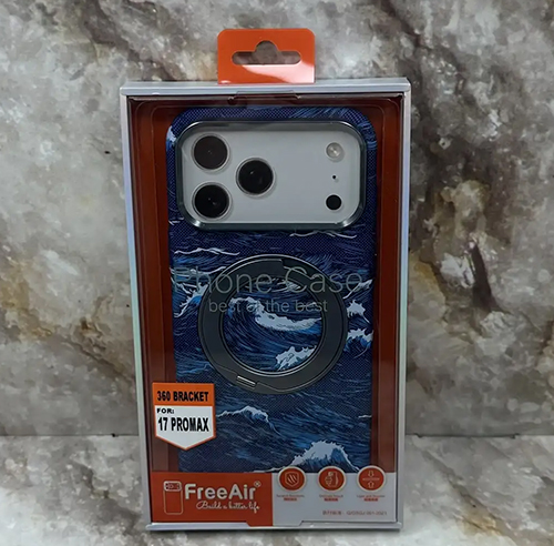 Задняя крышка Iphone 17 Pro Max FreeAir пластиковая под карбон, вращающийся MagSafe-подставка, в коробке, синие волны
