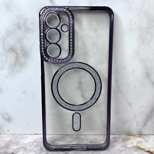Силиконовый чехол Samsung Galaxy S26 Ultra прозрачный, цветной борт со стразами, MagSafe из блесток, фиолетовый