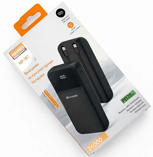 Аккумулятор внешний HAIMES HP-502B, 24000mAh, LED экран, PD25w, 2 встроенных кабеля Type-C / Lightning, порты USB / Type-C, цвет: черный