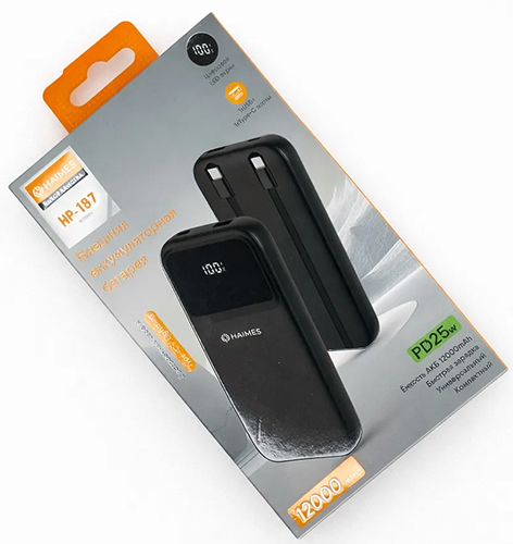 Аккумулятор внешний HAIMES HP-501B, 12000mAh, LED экран, PD25w, 2 встроенных кабеля Type-C/Lightning, порты USB/Type-C, цвет: черный