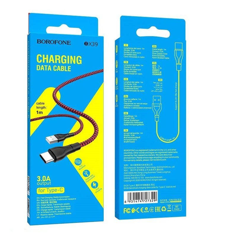 Кабель USB - Type-C Borofone BX39 1M, нейлоновая оплетка, 3A, красный