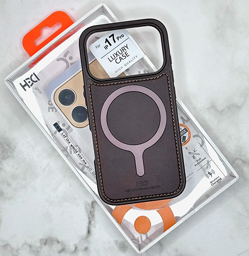 Задняя крышка HDD Iphone 17 Pro под кожу с прострочкой, металлический MagSafe, бархат внутри, темно-коричневая