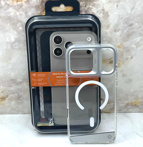 Задняя крышка KAJSA Iphone 17 Pro пластиковая, прозрачная, металлическая оконтовка камеры, MagSafe, серебро