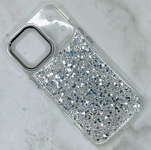 Задняя крышка Iphone 17 Pro прозрачная с блестками, металл. окантовка камеры и кнопки, в тех. паке, серебристая