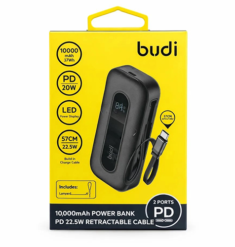 Аккумулятор внешний Budi 10000mAh, PD20w, LED, порты 2 Type-C, встроенный кабель Type-C, 57см, 22.5W, (PB808B), черный