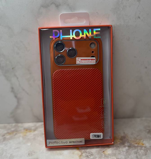 Задняя крышка Iphone 17 Pro Max PHONE под карбон, силиконовый борт, в коробке, оранжевая